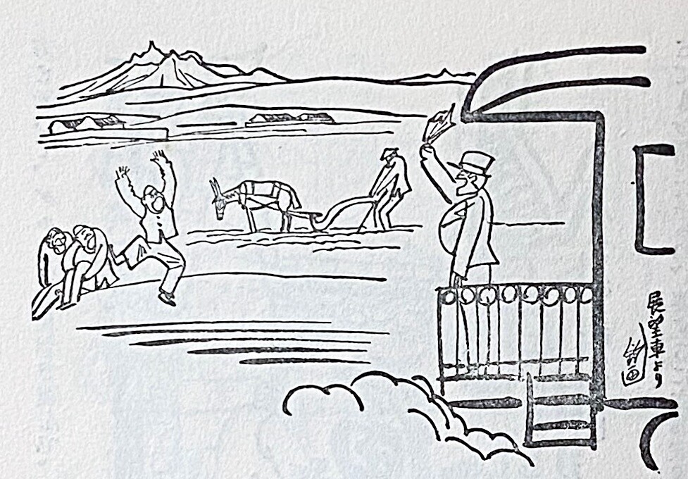 ▽同じく『漫画の満洲』より、展望車から「支那人」にハンカチをふっているところ。画:池部 鈞(俳優・池部良のお父さん)